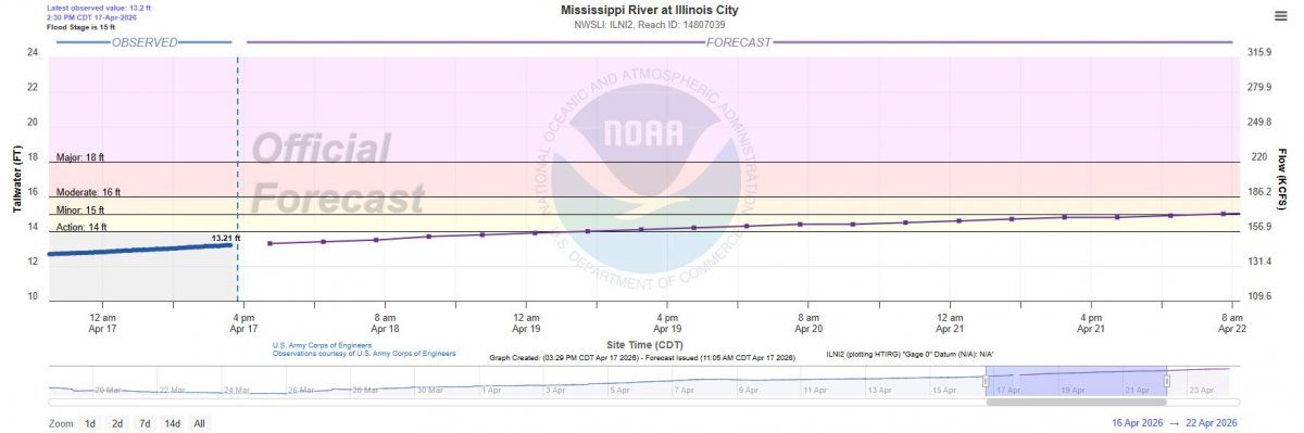 City officials are closely monitoring Mississippi River levels. The current forecast shows the river reaching 15 feet on April 22, 2026 which does not impact any areas within the City of Buffalo.